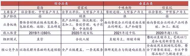 - 垂直品類、大B客戶型:主要服務(wù)于連鎖餐飲或者連鎖零售店的客戶,食材品類方面,往往專注于1-3個小品類。