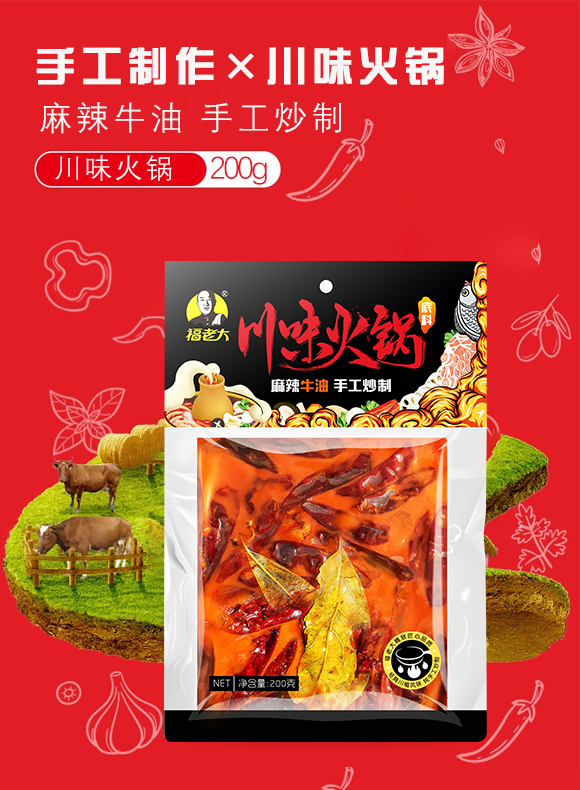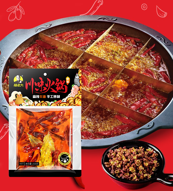 配料:食用牛油、郫縣豆瓣(辣椒、蠶豆、食用鹽、小麥粉、苯甲酸鈉)、辣椒、味精、雞精調(diào)味料、食用鹽、花椒、生姜、大蒜、洋蔥、白砂糖、豆鼓、香辛料、食品添加劑(山梨酸鉀、苯甲酸鈉、5 -呈味核苷酸二鈉)。