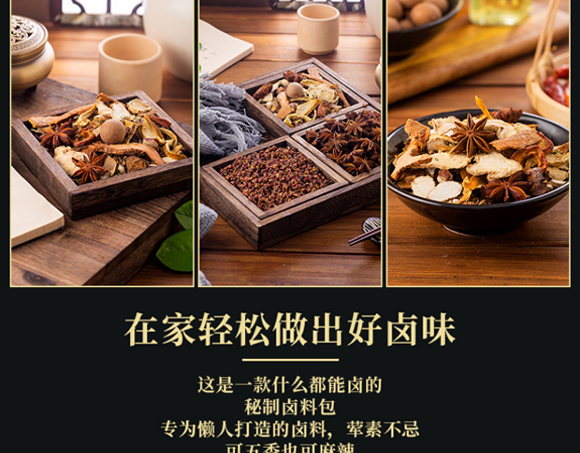 配料:茴香、白芷、桂皮、橘皮、山楂片、甘草、砂仁、八角、花椒、香葉(月桂葉)