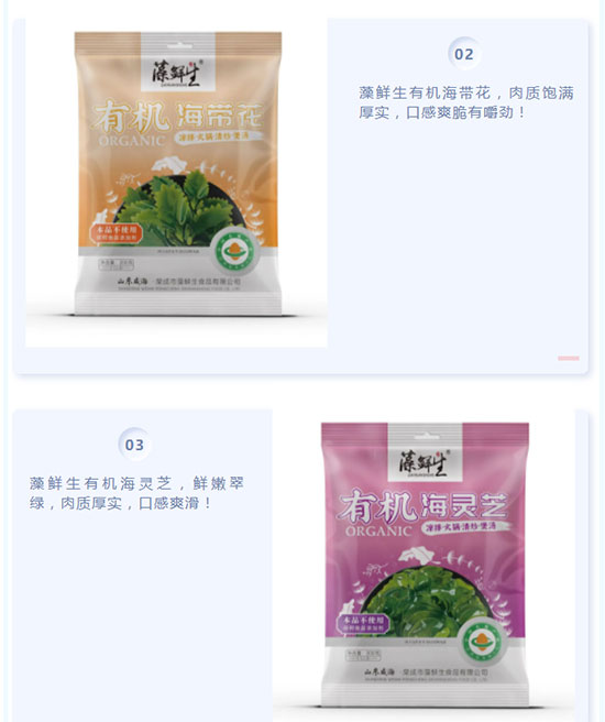 藻鮮生有機海帶系列新品,品類眾多,有有機海帶嫩苗、有機海帶花、有機海靈芝、有機裙帶菜、有機鞭炮筍5種產品類別,產品品質高,滿足終端消費者不同需求!