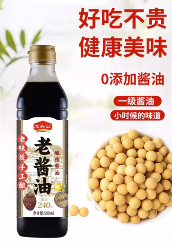 老味道,手工釀!龍頭山老醬油,一級醬油,只有4種原料,用簡單原料,豐富廚房美味!自然發酵,釀足240天,點蘸涼拌,各式炒菜樣樣精通!