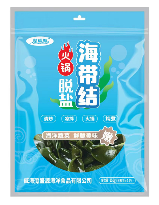 藻盛源火鍋脫鹽海帶結(jié),甄選原料,選用整條海帶中上部位置,采用特有的活結(jié)系法,做到水能在海帶結(jié)里自由流通,確保無沙無泥易入味,肉質(zhì)厚實(shí),口感鮮美,老少皆宜!食法多樣,可涼拌、煲湯、火鍋、紅燒、缽缽雞等。