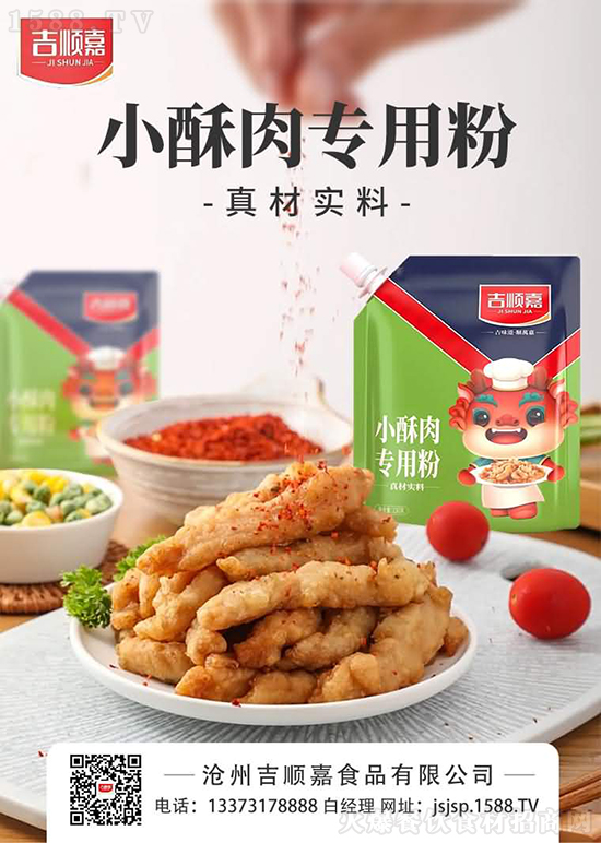 ta來了ta來了!ta帶著香氣走來了!吉順嘉小酥肉專用粉:優(yōu)選原料,甄選品質(zhì),粉質(zhì)細膩不結(jié)塊,無論蘸干碟、涮火鍋、搭米飯,小小酥肉,總能爆發(fā)出令人驚嘆的味道宇宙,一口一個,欲罷不能…火鍋,小吃店都從這里拿貨!
