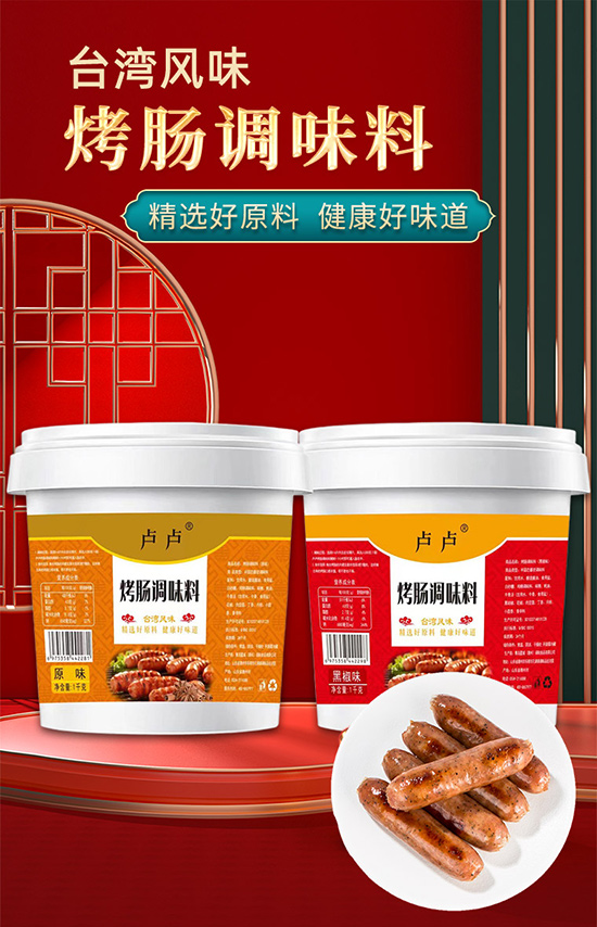 精選好原料,健康好味道!盧盧烤腸調味料,臺灣風味,有原味和黑椒味兩種經典味道,1公斤餐飲大桶裝,帶您掘金千億烤腸市場!