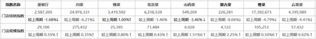 其中天津菜類目、臺灣菜類目、蒙古菜類目門店規模指數上漲明顯,分別上漲6.02%、2.82%、2.25%
