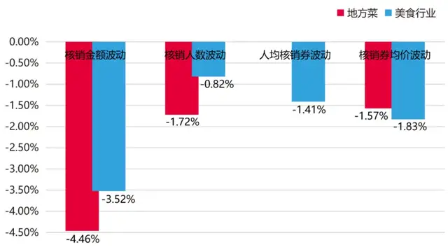 12月第1周地方菜類目門店核銷指數較11月第4周下降4.46%,門店規模指數較11月第4周上漲0.54%