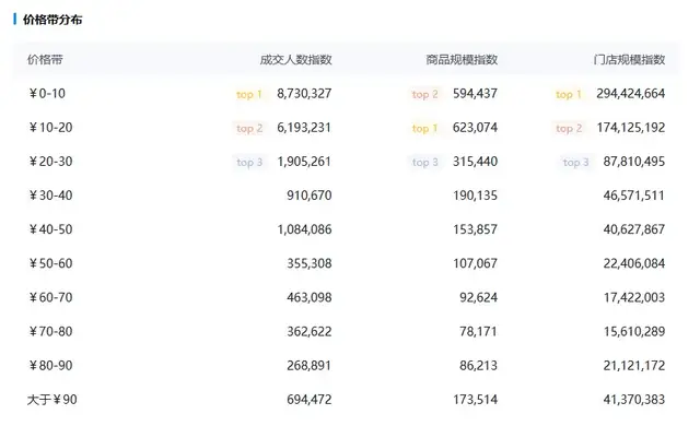 其中¥40-50價格帶、¥10-20價格帶、¥20-30價格帶商品規模指數上漲明顯,分別上漲0.83%、0.43%、0.14%