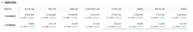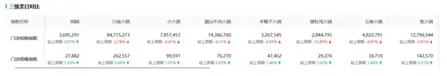 12月第1周火鍋類目門店核銷指數較11月第4周下降3.72%,門店規模指數較11月第4周上漲0.67%