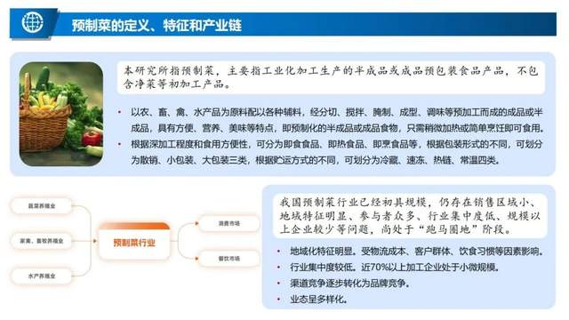 - 定義與特征:預制菜是以農、畜、禽、水產品為原料,配以輔料,經預加工而成的成品或半成品,具有方便、營養、美味等特點。