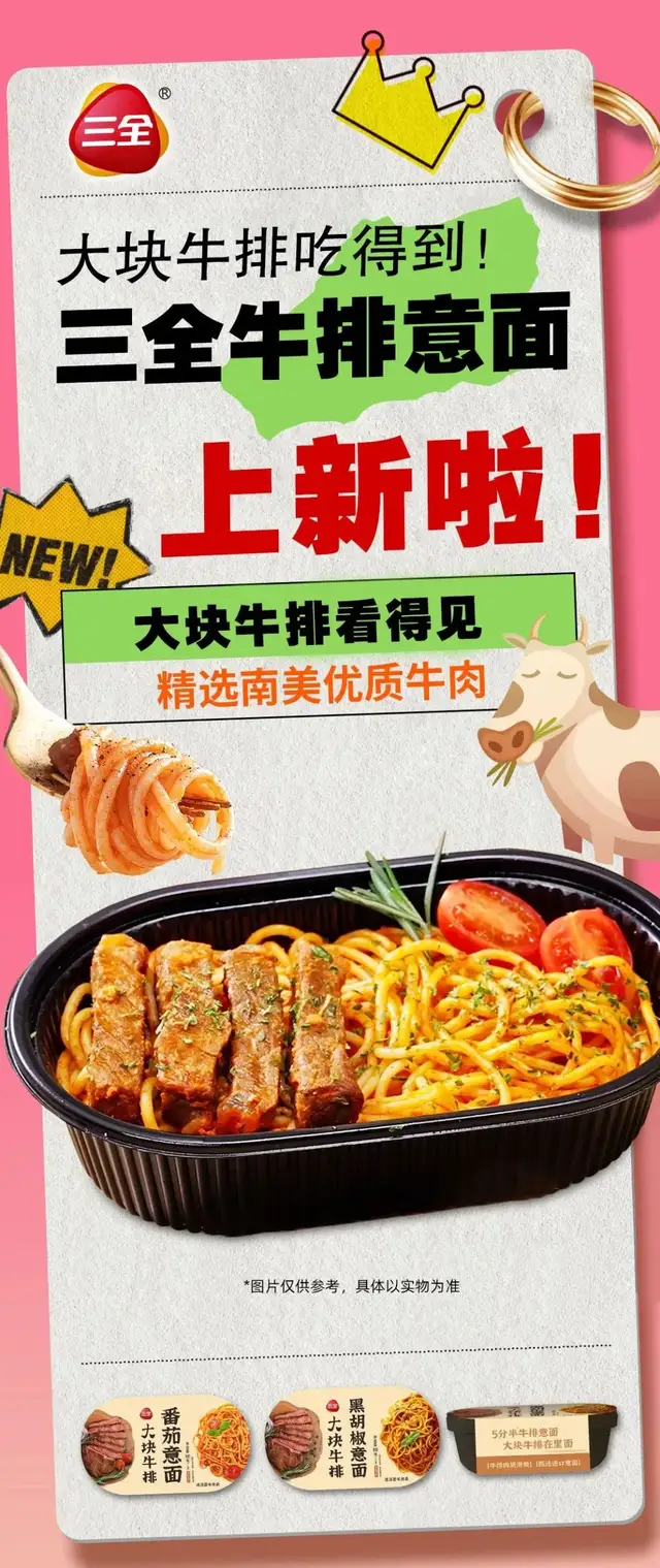 日前,三全推出牛排意面,大塊牛排看得見,精選南美優質生肉,挑除筋膜,大塊切條腌制入味,鮮嫩多汁,香氣四溢,每一口都是餐廳級的享受5分鐘吃大餐;杜蘭小麥意面,口感彈牙筋道,色澤金黃,味純正,含高蛋白,營養豐富,包含番茄口味和黑胡椒口味。不開火,不洗碗,無需解凍,撕開包裝膜,微波爐高火約5-7分鐘開吃。