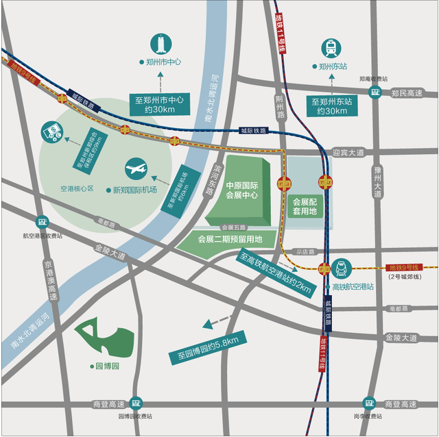 地鐵:新鄭機場站上車→機場東站→港區會展站下車,B 口出站,共2站,票價3元,步行至中原國際會展中心,約19分鐘。
