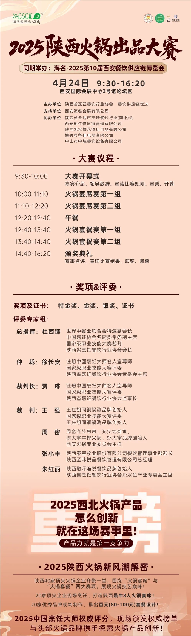 “2025陜西火鍋出品大賽”,4月24日將亮相海名·2025第十屆西安餐博會(huì) !省內(nèi)40家火鍋企業(yè)強(qiáng)勢(shì)集結(jié),同臺(tái)競(jìng)技,一展風(fēng)采!