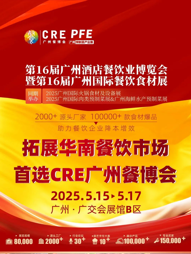 CRE廣州餐博會創辦于2011年,已成長為國內餐飲行業規模最大、影響力最強、品質最高的博覽會之一。聚焦餐飲全產業鏈,服務百萬餐飲同行,為餐飲產業鏈上、中、下游提供酒店餐飲業一站式采購解決方案;迎合中國酒店餐飲業高速增長,滿足業界不同領域業務需求而打造的全渠道整合、高效交流平臺。