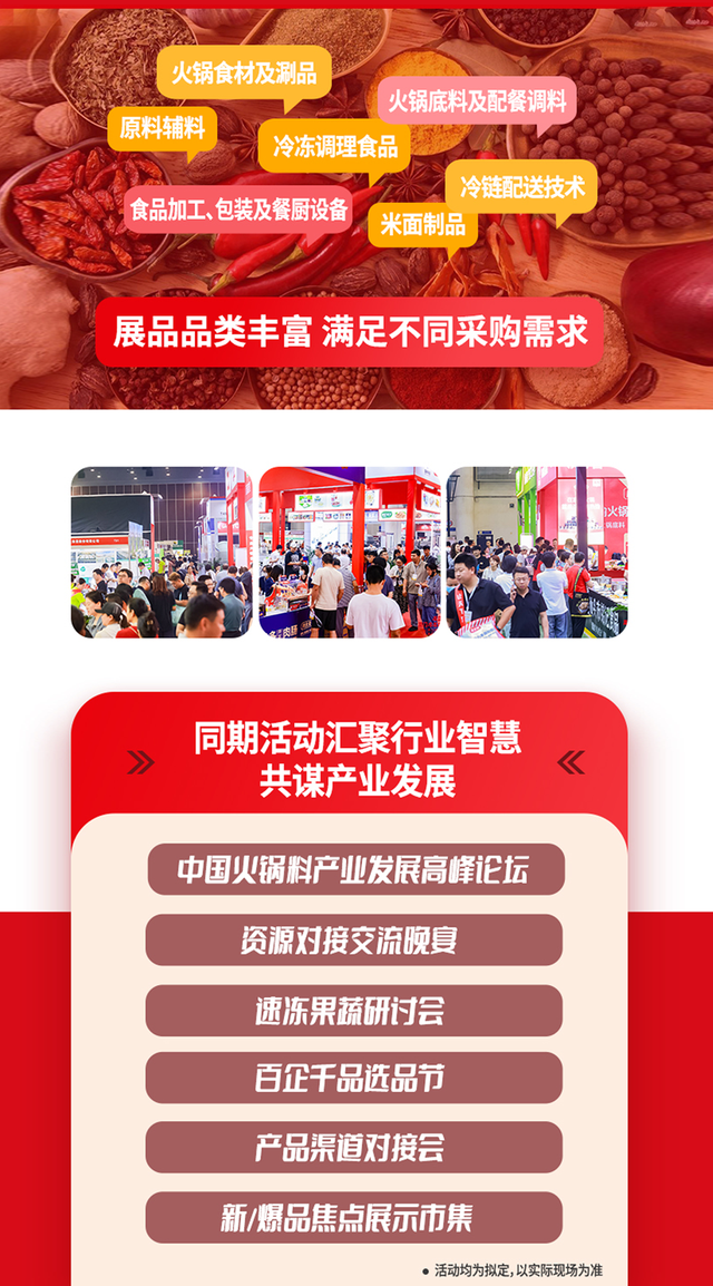 聚焦冷凍餐飲食材新紀元,深耕火鍋與燒烤食材新藍海!5月20-22日,廈門國際會展中心,【第十三屆中國火鍋料節(jié)】即將熱辣來襲~同期還將舉辦第二屆中國冷凍冷藏食品博覽會(廈門)、火鍋燒烤食材展、餐飲暨預制食材展。展品范圍涉及火鍋食材及涮品、冷凍調(diào)理食品、米面制品、火鍋燒烤食材、火鍋底料及配餐調(diào)料、原料輔料、冷鏈配送技術、餐廚設備等全產(chǎn)業(yè)鏈。此外,還有中國火鍋料產(chǎn)業(yè)發(fā)展高峰論壇、資源對接交流晚宴、速凍果蔬研討會、百企千品選品節(jié)等精彩活動,場場精彩!