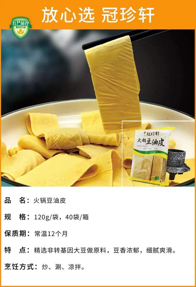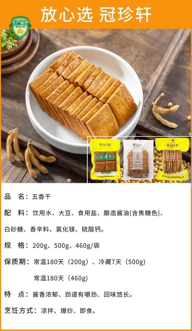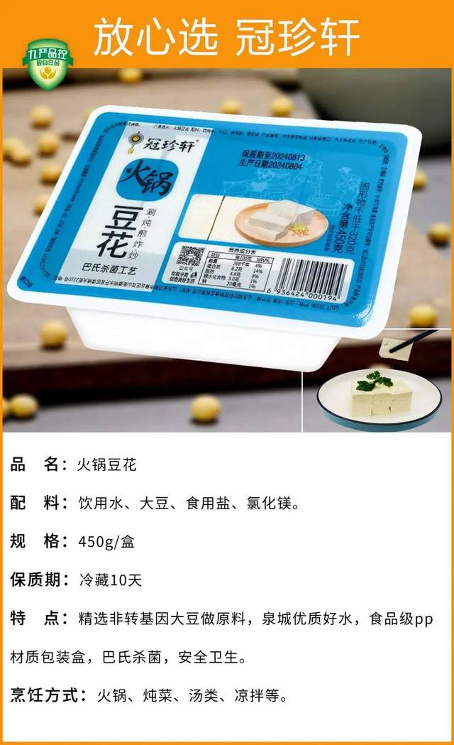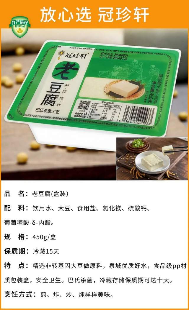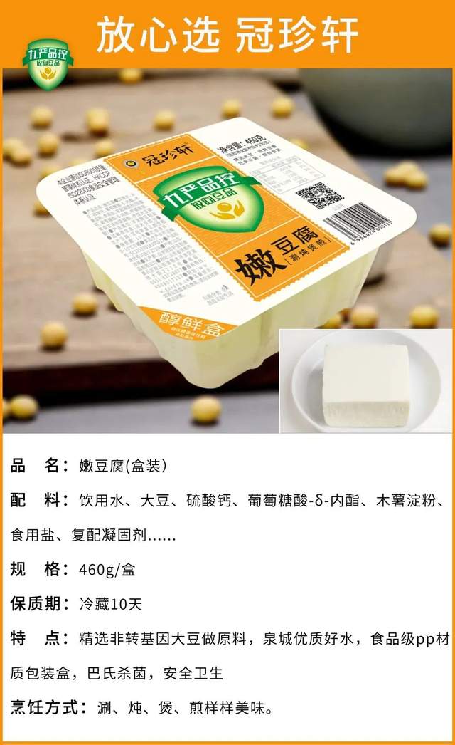公司目前主營產品系列有生鮮豆腐系列、預包裝豆腐系列、豆腐皮系列、調味豆腐干系列、蛋白素肉系列、油炸豆腐系列、大豆蛋白飲品系列、優選系列八大系列80余款產品。另外,冠珍軒在行業內率先實現了生鮮豆腐制品的預包裝化,巴氏殺菌,保質期在低溫冷藏條件下可延長至十天,使豆腐制品的質量安全得到了有效保障。所有豆制品都有冷鏈配送物流車送至終端經銷商戶,經銷商戶通過冷藏保鮮后售賣至消費者,保證每一塊豆制品的新鮮美味。