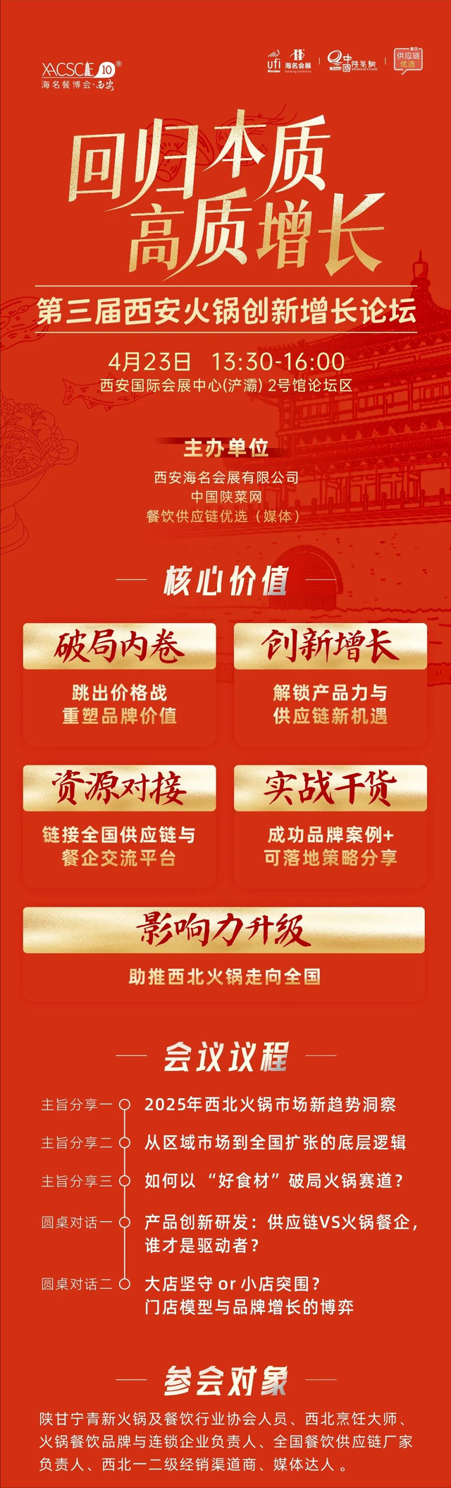 引言:破局內卷,創新突圍!西安火鍋門店超8000家,密度全國第二!但繁榮背后,品牌競爭激烈、供應鏈滯后、低價內卷等問題暗流涌動。如何突破困局?第三屆西安火鍋創新增長論壇應勢而來!2025年4月23日,西安國際會展中心(浐灞),行業大咖齊聚,聚焦“回歸本質·高質增長”,共探西北火鍋破局之道!