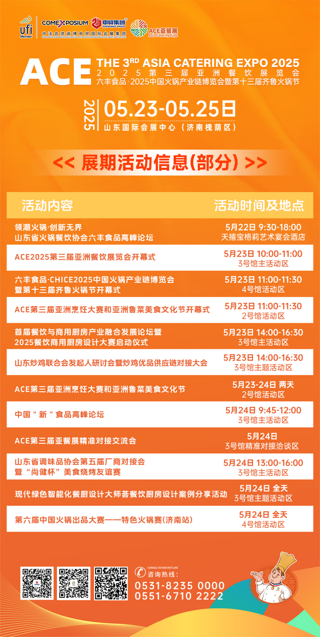 為更好的體現展會交流對接平臺價值,在本屆展會現場還將舉辦十余場行業論壇、大賽、交流會、對接會等活動。包括:領潮火鍋·創新無界——山東省火鍋餐飲協會六豐食品高峰論壇、ACE2025第三屆亞洲餐飲展覽會開幕式、六豐食品·CHICE2025中國火鍋產業鏈博覽會暨第十三屆齊魯火鍋節開幕式、ACE第三屆亞洲烹飪大賽和亞洲魯菜美食文化節、ACE第三屆亞餐展精準對接交流會、首屆餐飲與商用廚房產業融合發展論壇暨2025餐飲商用廚房設計大賽啟動儀式、中國"新"食品高峰論壇、山東省調味品協會第五屆廠商對接會暨“尚健杯”美食燒烤友誼賽、現代綠色智能化餐廚設計大師薈-餐飲廚房設計案例分享會、第六屆中國火鍋出品大賽——特色火鍋賽(濟南站)等。