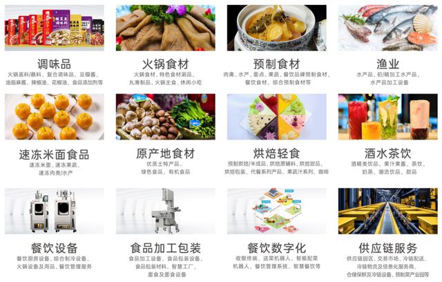 餐飲設備:節能爐灶、烹飪設備、消毒清洗設備、不銹鋼調理設備、環保通風設備、智慧食堂、酒店餐飲工程服務、冷藏冷凍設備、食品保溫保鮮設備、速凍設備、制冰機類、餐飲冷鏈配送、電磁爐、智能火鍋設備、火鍋家具、火鍋底料加工設備等火鍋用品、密胺餐具、陶瓷餐具、不銹鋼制品、環保及外賣餐盒、餐巾用紙、玻璃竹木等用品、點餐及收銀設備、移動餐車、餐飲管理服務、智能機器人......