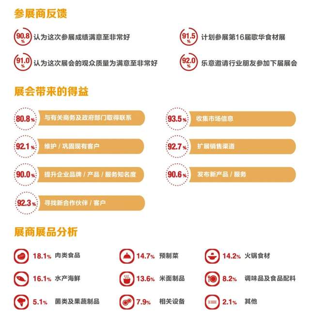 上海國際餐飲食材展(歌華食材展)作為餐飲食材行業的風向標,已深耕行業十五載,展品范圍覆蓋食材行業上、中、下游全產業鏈,是餐飲食材行業規模領先、品類齊全的行業交流盛會,也是發掘商機、技術交流及洞悉行業趨勢的專業平臺。上屆展會總展出面積達到150,000平方米,共吸引到全球3,017家展商和107,839人次觀眾參加。