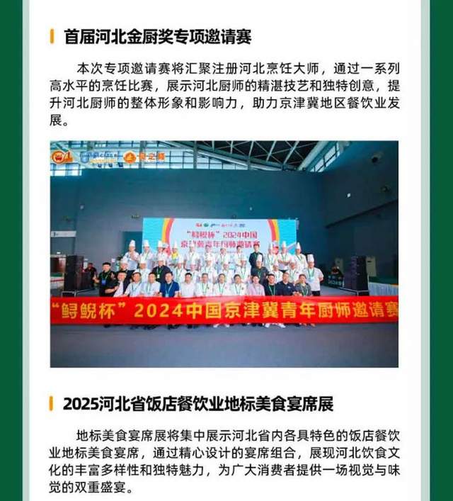 展會同期舉辦“2025京津冀團餐快餐、供應鏈與新零售品牌建設發展論壇"全國烤鴨技能烹飪(京津冀)邀請賽暨烤鴨產業發展大“2025第六屆冀菜產業發展大會”、“2025河北省飯店會”、餐飲業地標美食宴席展”等主題活動。