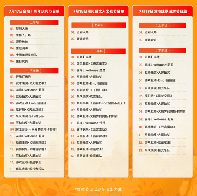 ·天地之中,功夫鼓舞,點燃全場,展現河南力量!·花海LiveHouse人氣歌手-莉亞,點燃慶典之夜!·天地龍鱗,響徹寰宇!龍獅共舞,震撼全場!·豫劇新唱,混搭RAP,感受最潮河南范兒!