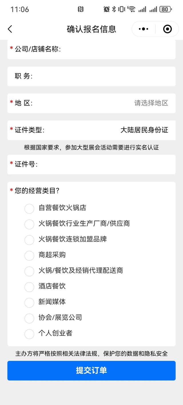 2.根據系統提示選填相關信息后提交。(如之前填寫過相關信息,可點擊提交訂單)
