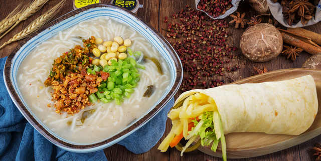 吳弟粉漿面是以豆漿發酵做湯底,搭配芹菜葉下面而成,在加上芝麻醬、花生碎,芹菜粒,一碗粉漿面條就做好了。漿面條口感微酸,軟糯易消化,老少皆宜。烙饃卷豆腐串是一張烙饃卷高湯鹵制的登封豆腐串,搭配黃瓜絲和荊芥,輔以小料芝麻醬、辣椒醬,手工卷制而成,勁道鮮香,醬汁濃郁。