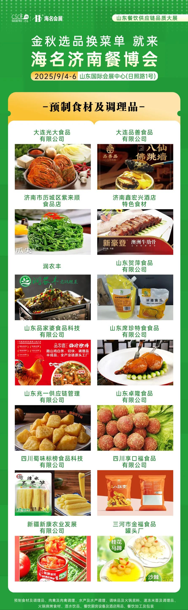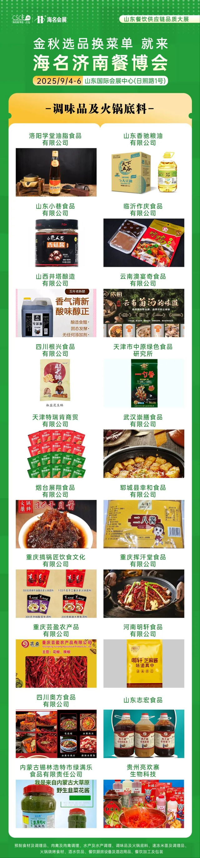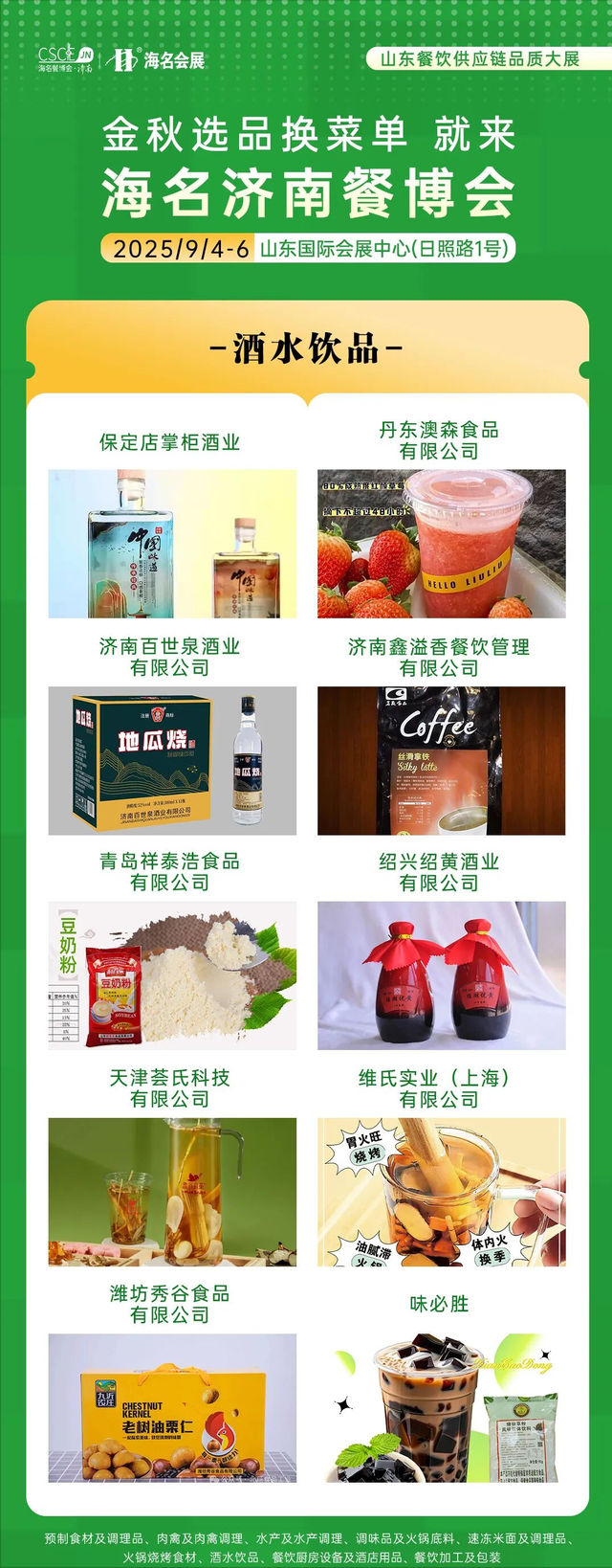 海名·2025第11屆濟南餐博會參展展商展品在往屆基礎上更加豐富,滿足餐飲供應鏈上下游企業需求。9大主題展區,30+品類縱深產業鏈融合,集結食材源頭廠家,火鍋燒烤食材、肉禽及肉禽調理、水產及水產調理、速凍米面、預制食材、調味品、酒水飲品、餐飲加工及包裝、餐廚設備及酒店用品等新產品、新技術、新模式集中亮相。