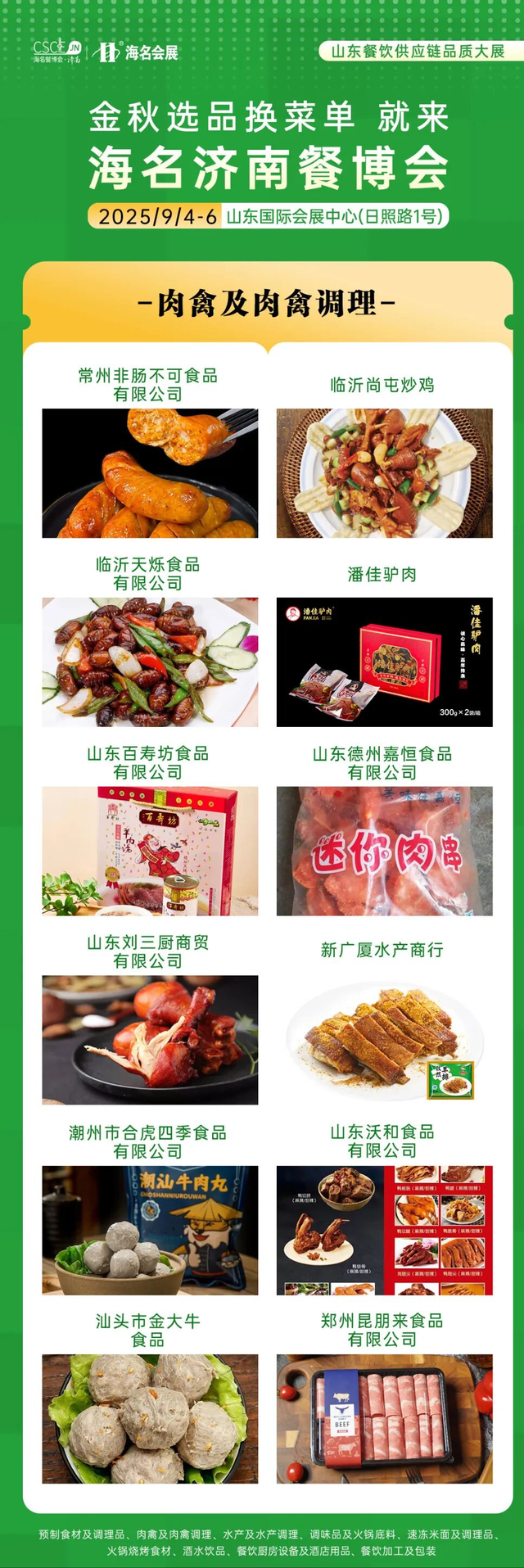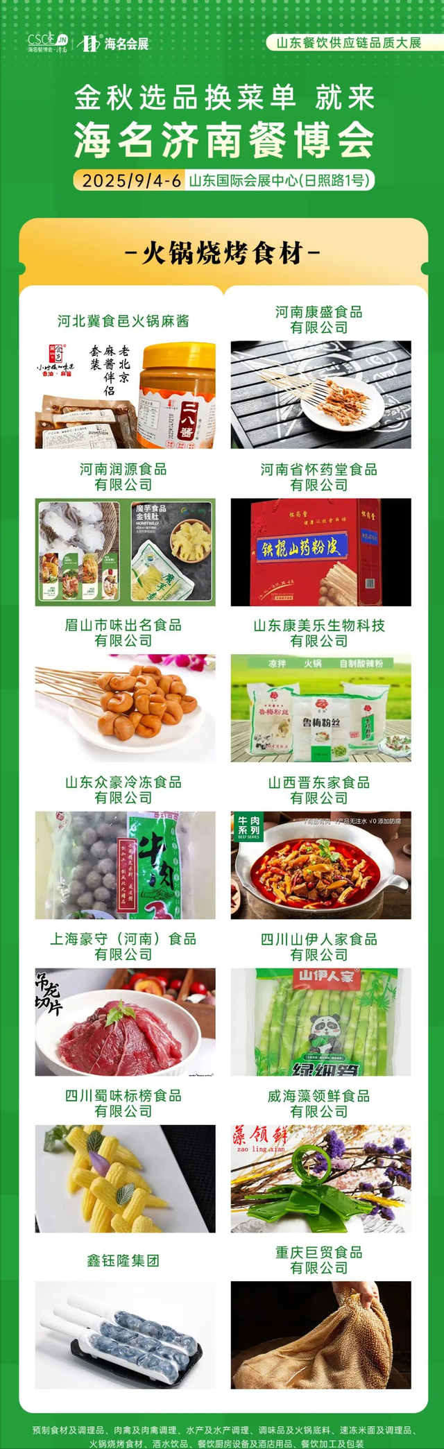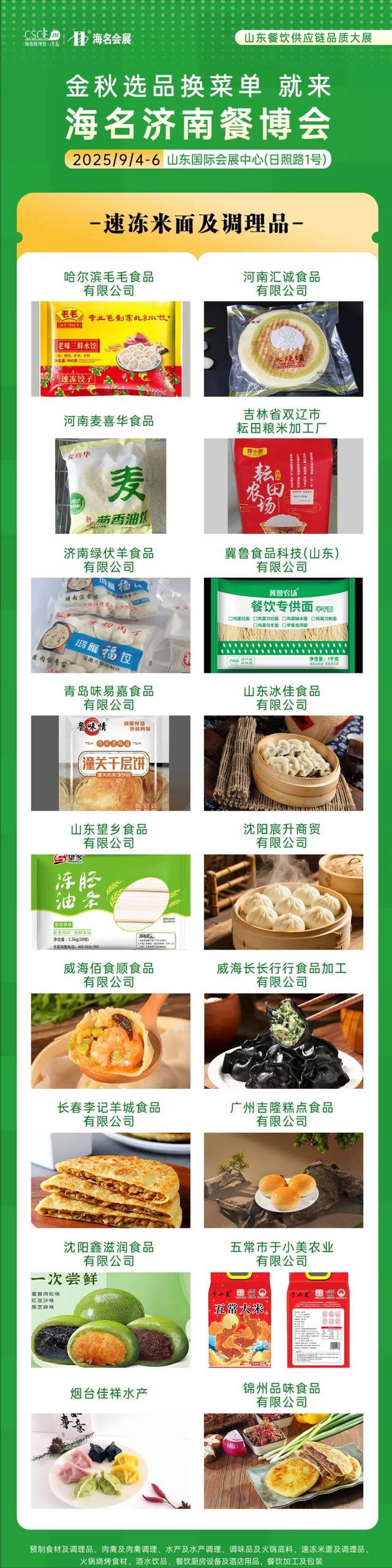 海名·2025第11屆濟南餐博會參展展商展品在往屆基礎上更加豐富,滿足餐飲供應鏈上下游企業需求。9大主題展區,30+品類縱深產業鏈融合,集結食材源頭廠家,火鍋燒烤食材、肉禽及肉禽調理、水產及水產調理、速凍米面、預制食材、調味品、酒水飲品、餐飲加工及包裝、餐廚設備及酒店用品等新產品、新技術、新模式集中亮相。