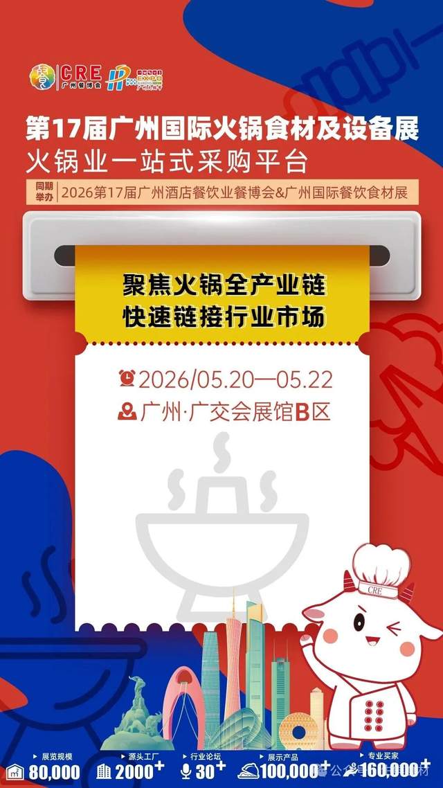 CRE·2026第17屆中國(廣州)火鍋食材及設備展(以下簡稱“CRE·廣州火鍋展”)將于2026年5月20-22日在廣州·廣交會展館B區隆重舉行!展會規模達80,000平方米,聯動2,000+品牌展商+100,000款爆品重磅亮相CRE·廣州火鍋展。