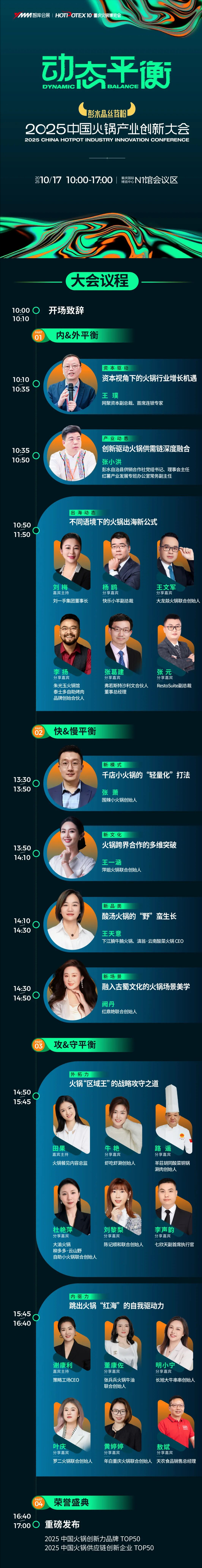 網聚資本、快樂小羊、劉一手、圍辣、羊荘胡同、蝦吃蝦涮、大龍燚、朱光玉、陳記順和、滇翁、下江腩、萍姐、朱光玉、紅鼎艷、鹵校長、七欣天、年白、張兵兵、長旭大牛、羅二、天農、沙利文、RestoSuite、火鍋餐見、策略工廠…30+品牌大咖、業界專家、行業媒體人,以“動態平衡”之名,聚焦火鍋產業9大熱點議題,從資本視角到供需融合,從新模式、新文化、新品類到新場景,進行6大主題分享;圍繞出海、品牌外拓力、企業內驅力開展3場圓桌探討,2大榜單發布帶來一場聚焦火鍋產業“變”與“不變”的思想碰撞,通過毫無保留的經驗分享,希望為千萬火鍋從業者帶來一些靈感與啟發。