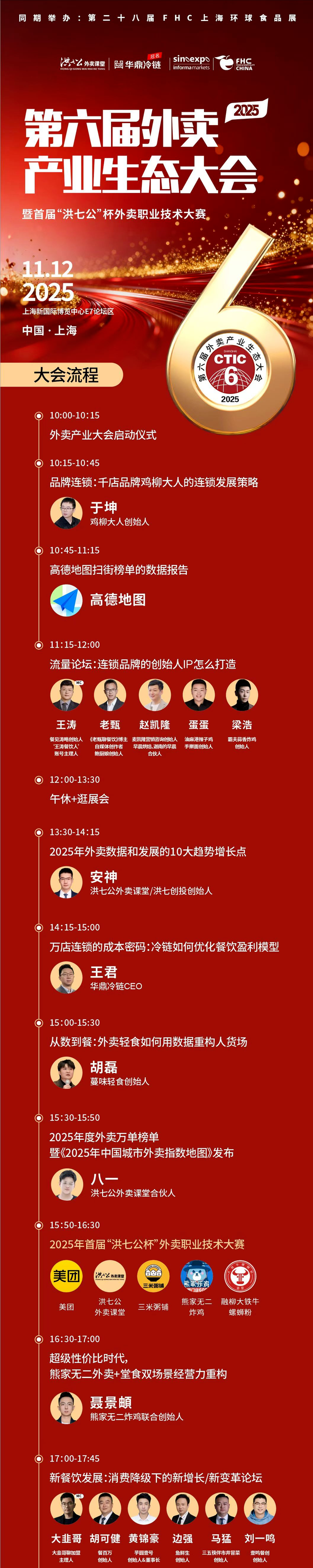在主題內(nèi)容上,大會(huì)將舉辦“2025年第六屆外賣產(chǎn)業(yè)生態(tài)大會(huì)主題論壇”暨首屆“洪七公”杯外賣職業(yè)技術(shù)大賽等主題活動(dòng),邀請(qǐng)分享嘉賓多達(dá)17位,到場(chǎng)嘉賓500位+,同時(shí)大會(huì)發(fā)布四大榜單,為大家呈現(xiàn)最精彩的餐飲體系和外賣內(nèi)容。